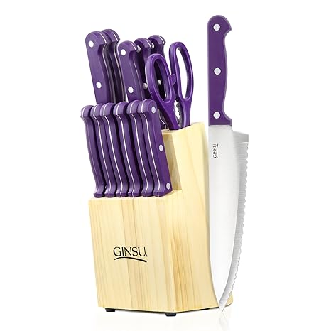 Ginsu Essential Series 14 Piece Stainless Steel Serrated Knife Set Cutlery Set With Purple Kitchen Knives In A Natural Block 03878ds
