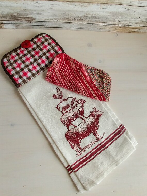 Farm Fresh Hanging Towel And Dishcloth Set French Country Kitchen Towel Set Farm Animal Hanging Towel Set Bridal Shower Gift