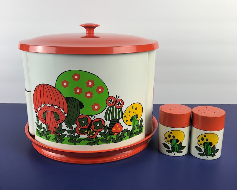 Funky Retro Revolving Mushroom Canister Set And Salt Pepper Shakers 1960s Mcm Mushrooms Revolving Metal Lazy Susan Kitchen Canisters Lot
